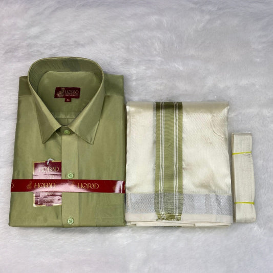 Horad Premium Art Silk FIR.Green Shirt + Cream with FIR.Green+Silver Border Dhoti + Angavastram + Belt