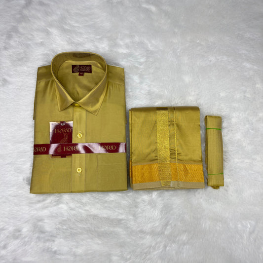 Horad Premium Art Silk Dark Gold Shirt + Dhoti + Angavastram + Belt