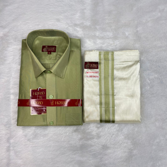 Horad Premium Art Silk Pista Green Shirt + Cream with Green border Dhoti