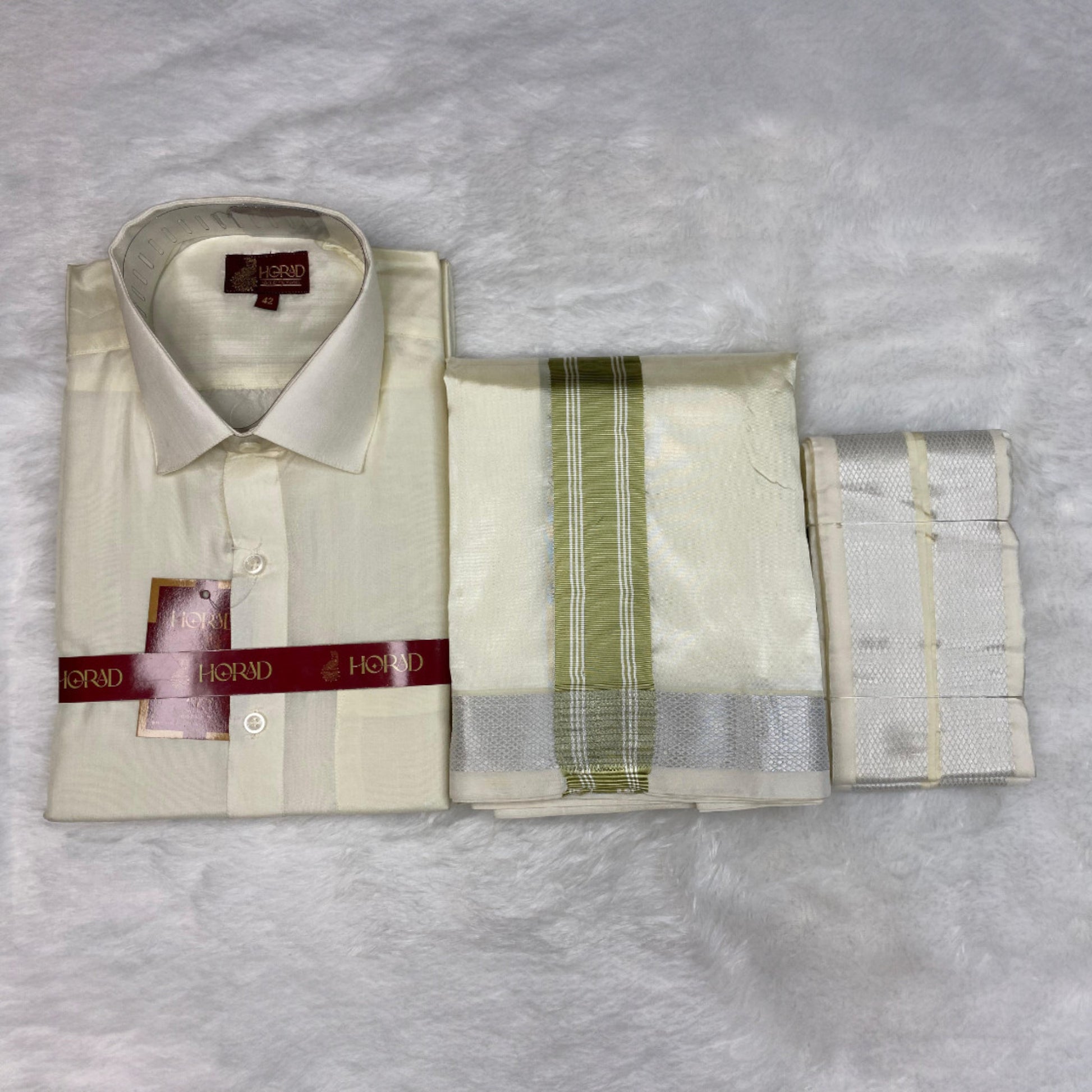 Horad Premium Art Silk Cream Shirt + Cream with FIR.Green+Silver Border Dhoti + Angavastram