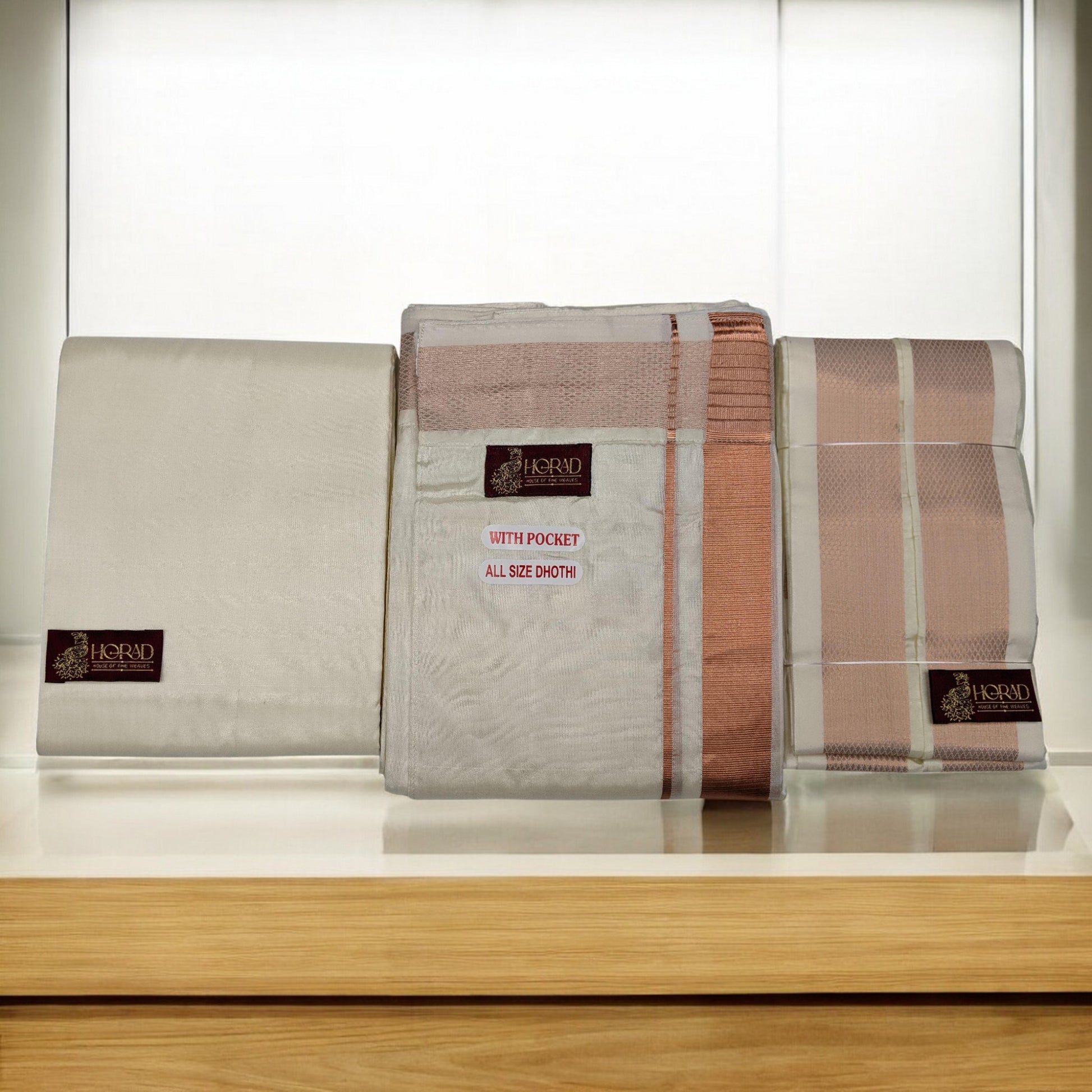 HORAD Premium Art Silk Cream Welcro Dhoti with Shirt Material + Angavastram