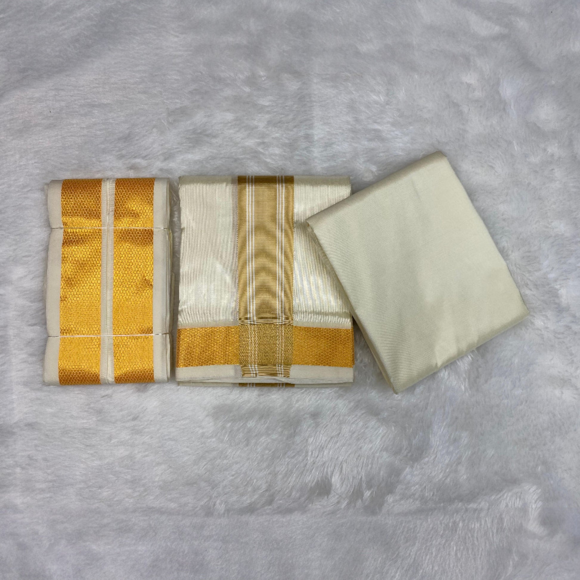 HORAD Premium Art Silk Cream with Gold Border Dhoti with Cream Shirt Material + Angavastram