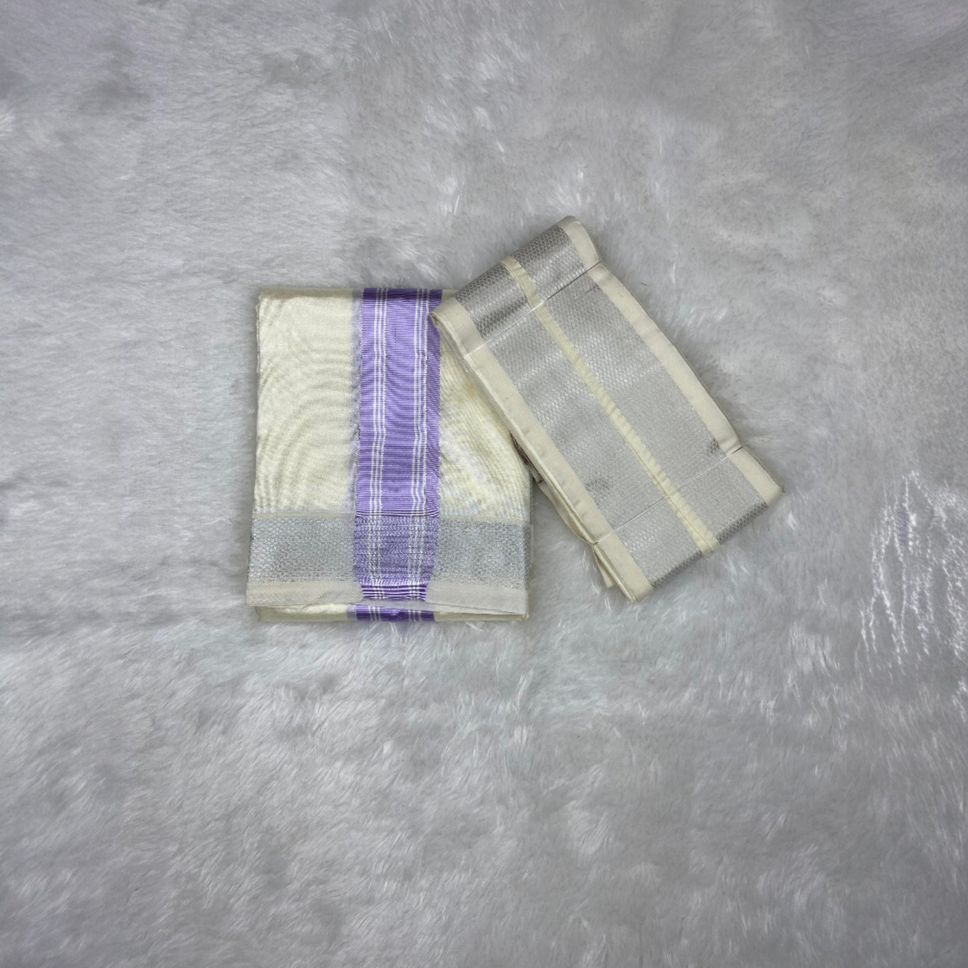 HORAD Premium Art Silk Cream with Lavender+Silver Border Dhoti + Angavastram