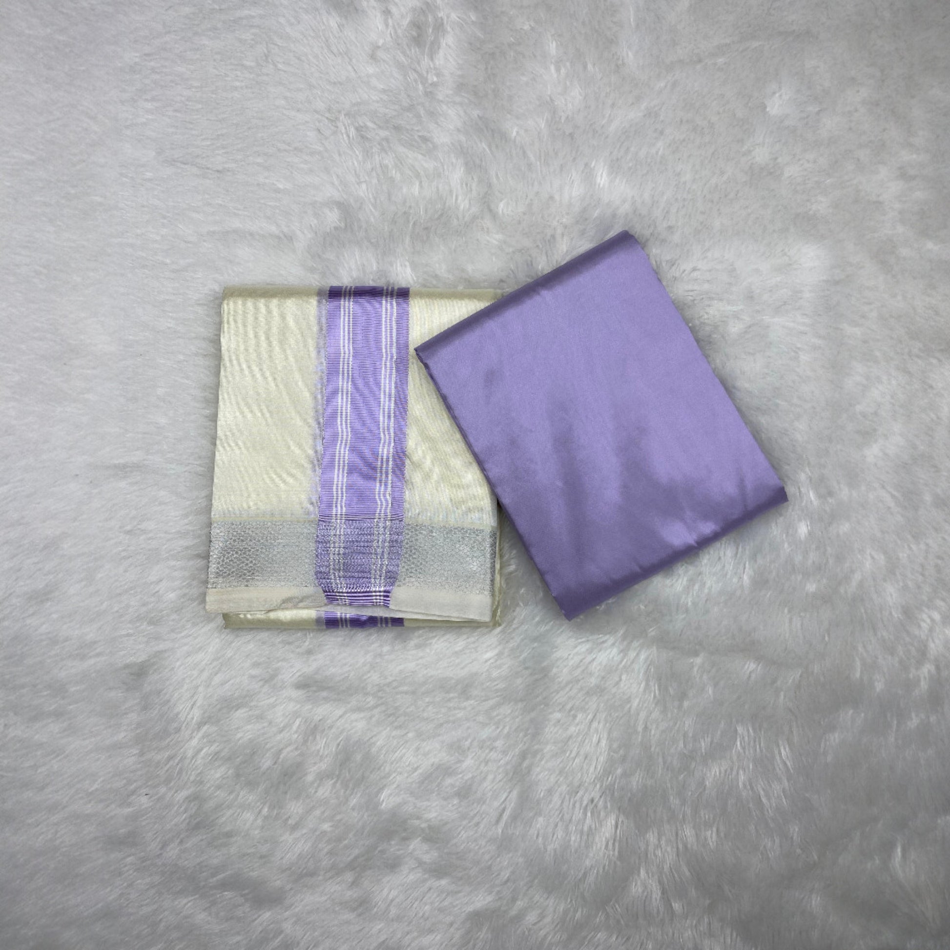 HORAD Premium Art Silk Cream with Lavender+Silver Border Dhoti with Lavender Shirt Material