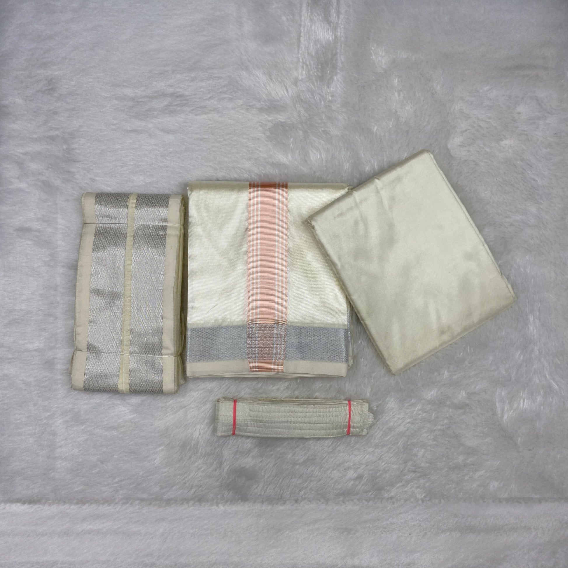 HORAD Premium Art Silk Cream with Rose Gold+Silver Border Dhoti with Cream Shirt Material + Angavastram + Belt