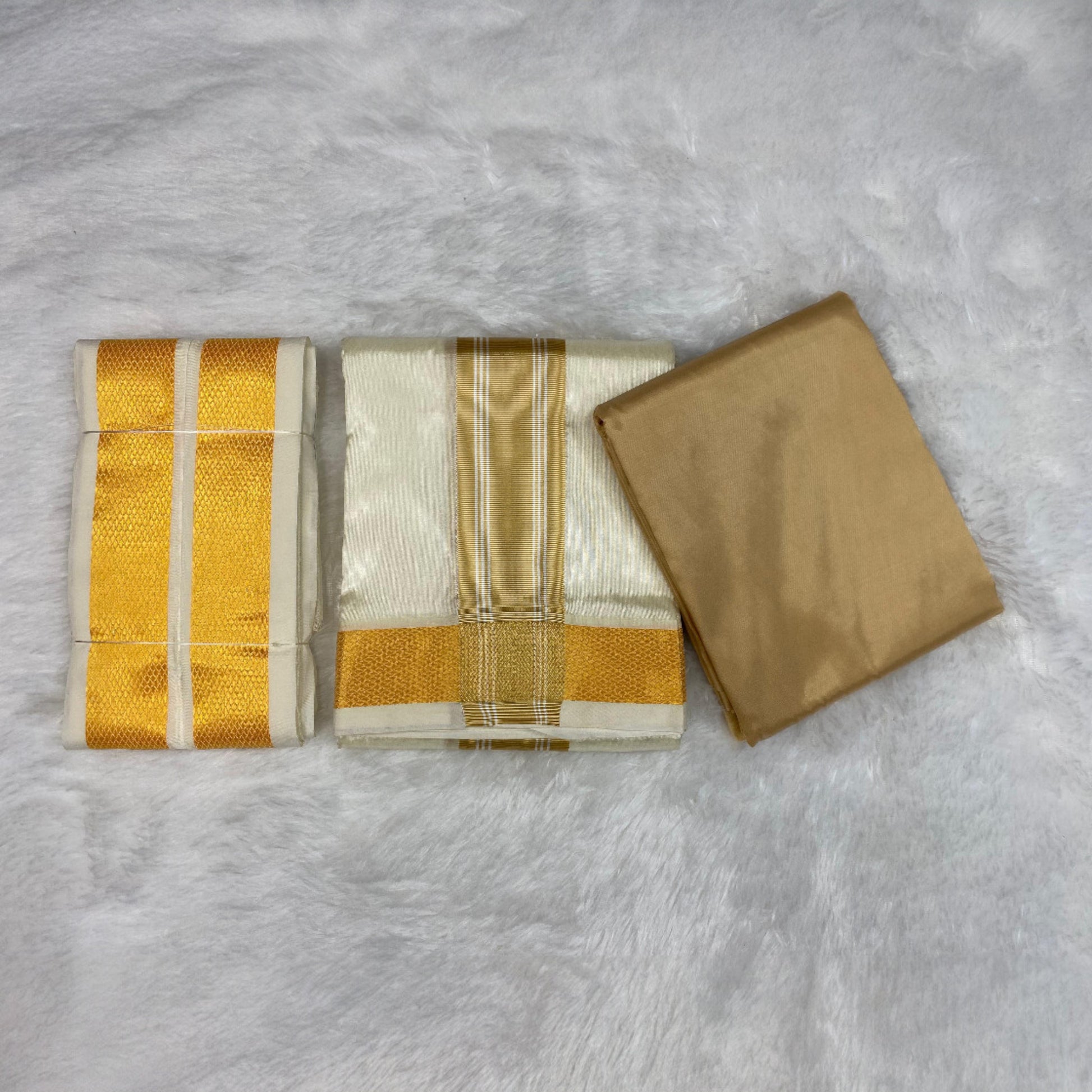 HORAD Premium Art Silk Gold with Gold Border Dhoti with Cream Shirt Material + Angavastram