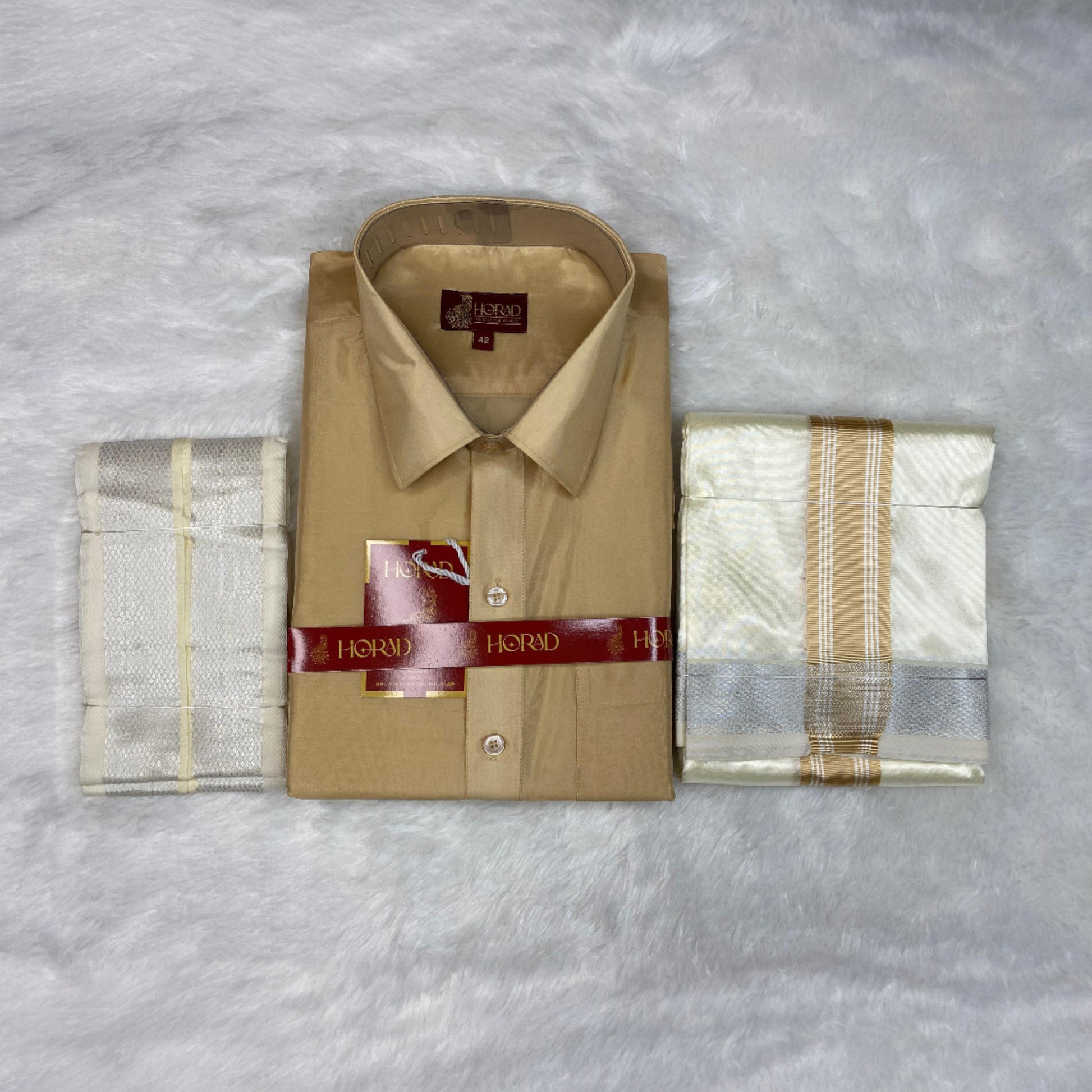 Horad Premium Art Silk Light Gold Shirt +Cream with Gold + Silver Border Dhoti + Angavastram